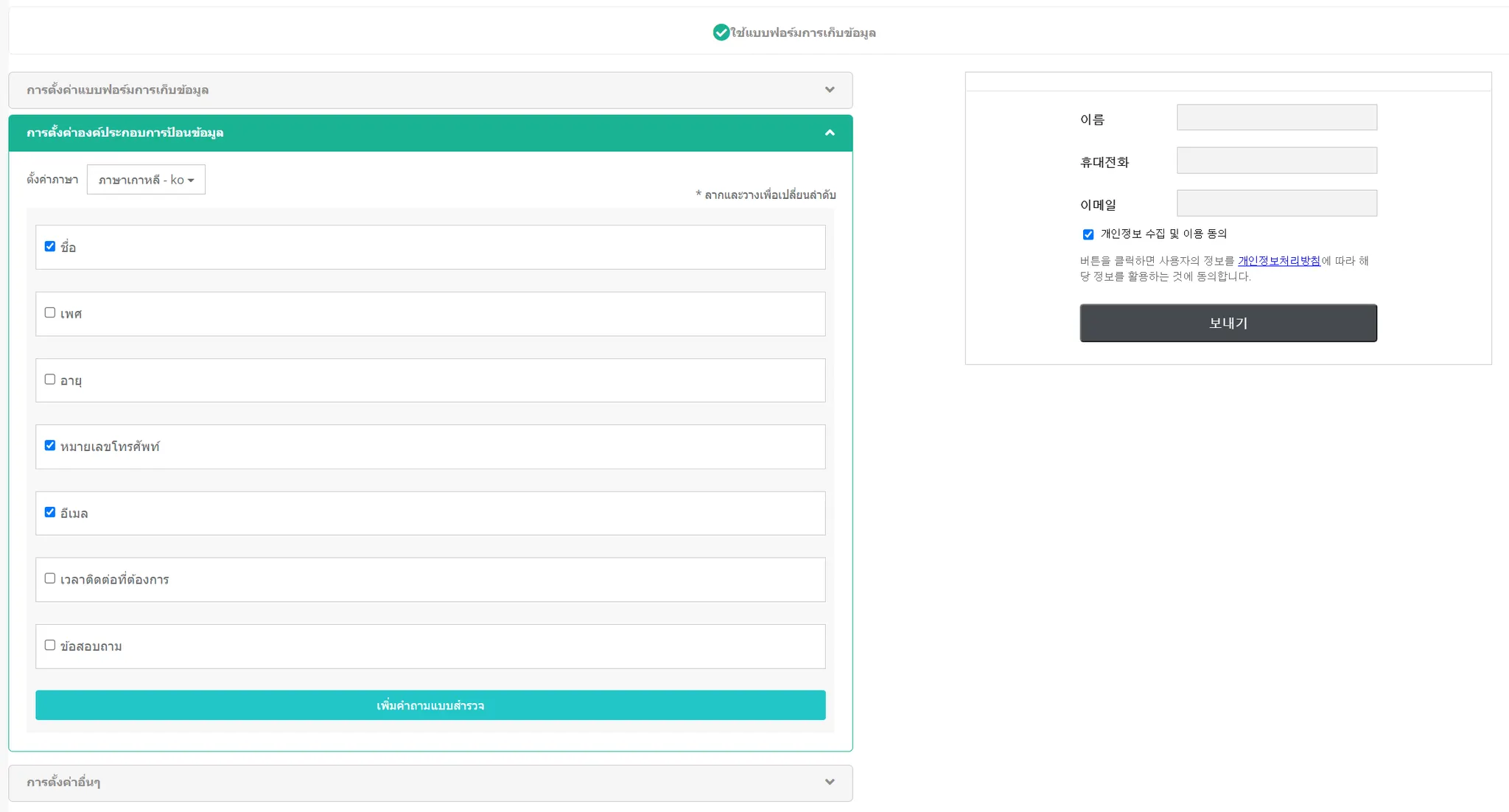 ใส่เครื่องหมายถูกที่ปุ่ม 'ใช้แบบฟอร์มการเก็บข้อมูล' และตั้งค่า template แบบฟอร์ม โดย template นี้จะปรากฏขึ้นในบริเวณที่คุณได้แทรกแบบฟอร์มเข้าไป