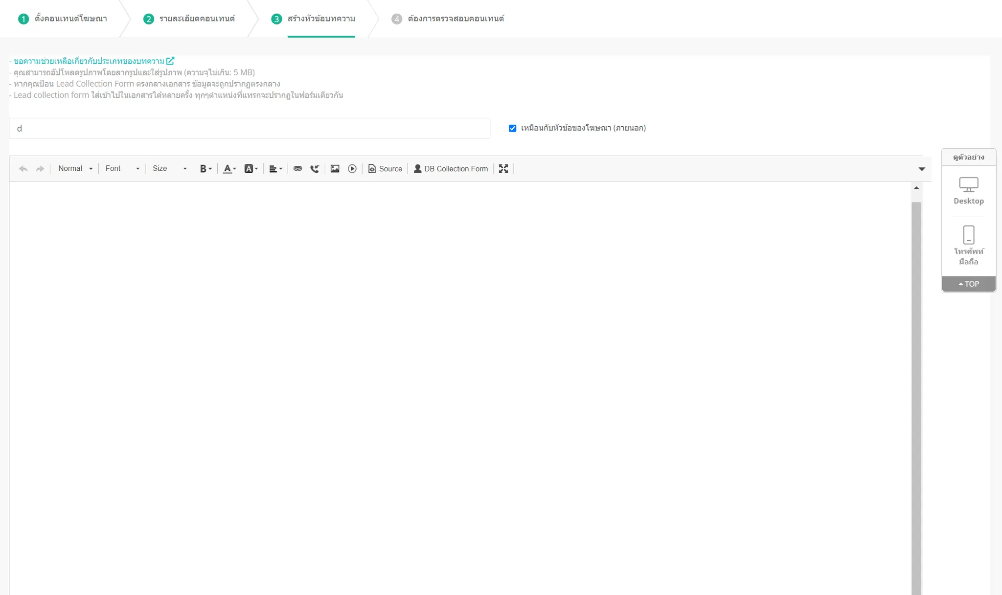 เพิ่มชื่อโฆษณา คำอธิบายโฆษณา และรูปภาพ เปิดใช้งานคุณลักษณะการติดตามหากจำเป็น สำหรับรายละเอียดเกี่ยวกับวิธีการสร้างเนื้อหา กรุณาคลิกตรงนี้