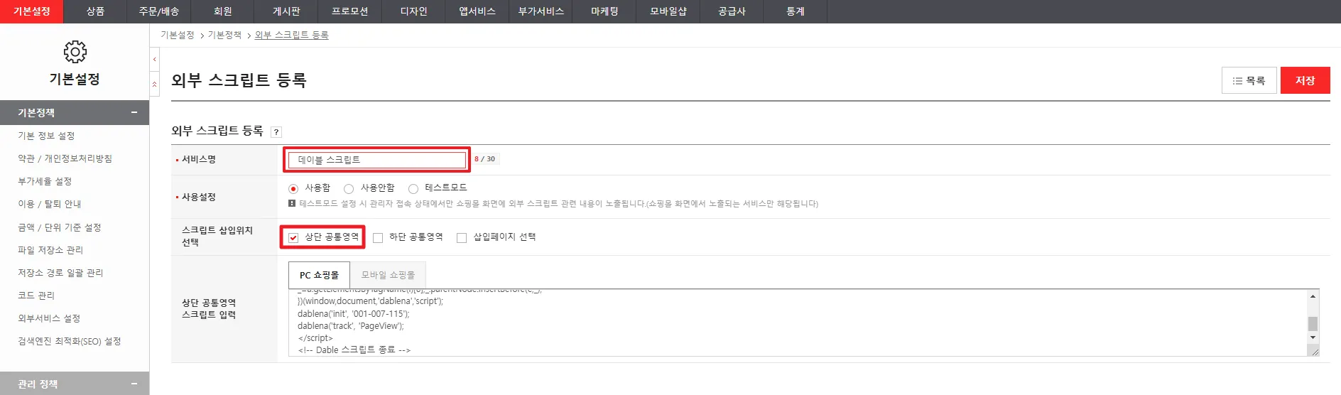 경로: 외부 스크립트 등록 > 사용 설정 > 사용함 > 상단 공통영역에 설치