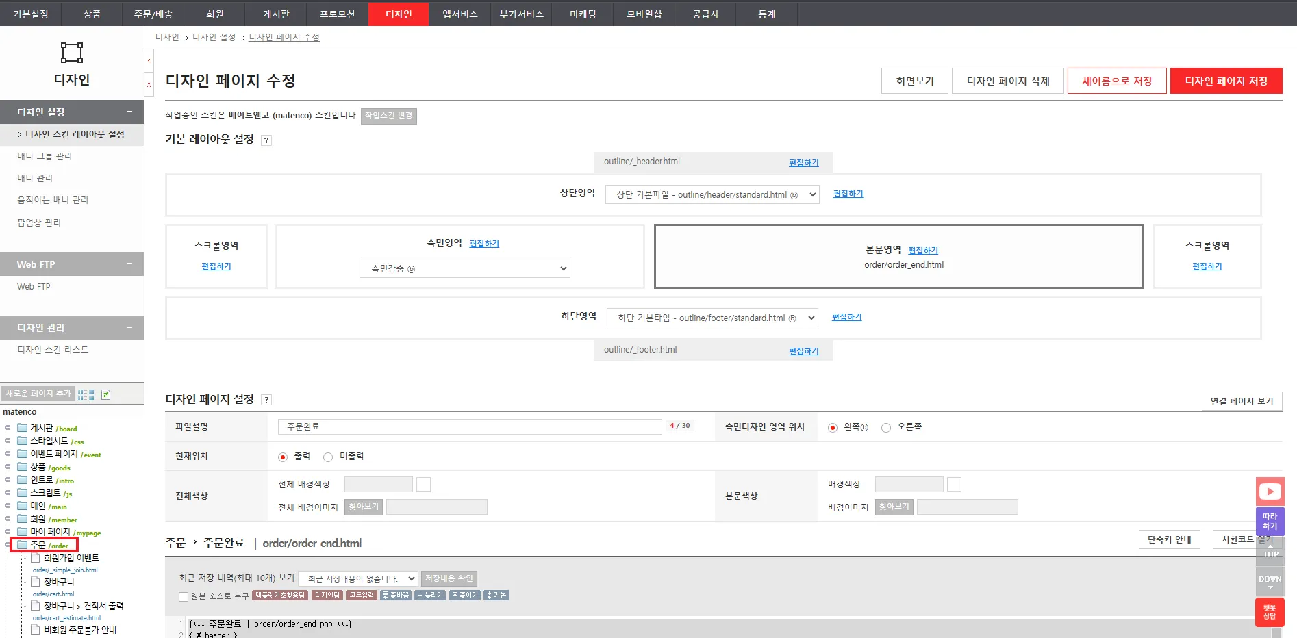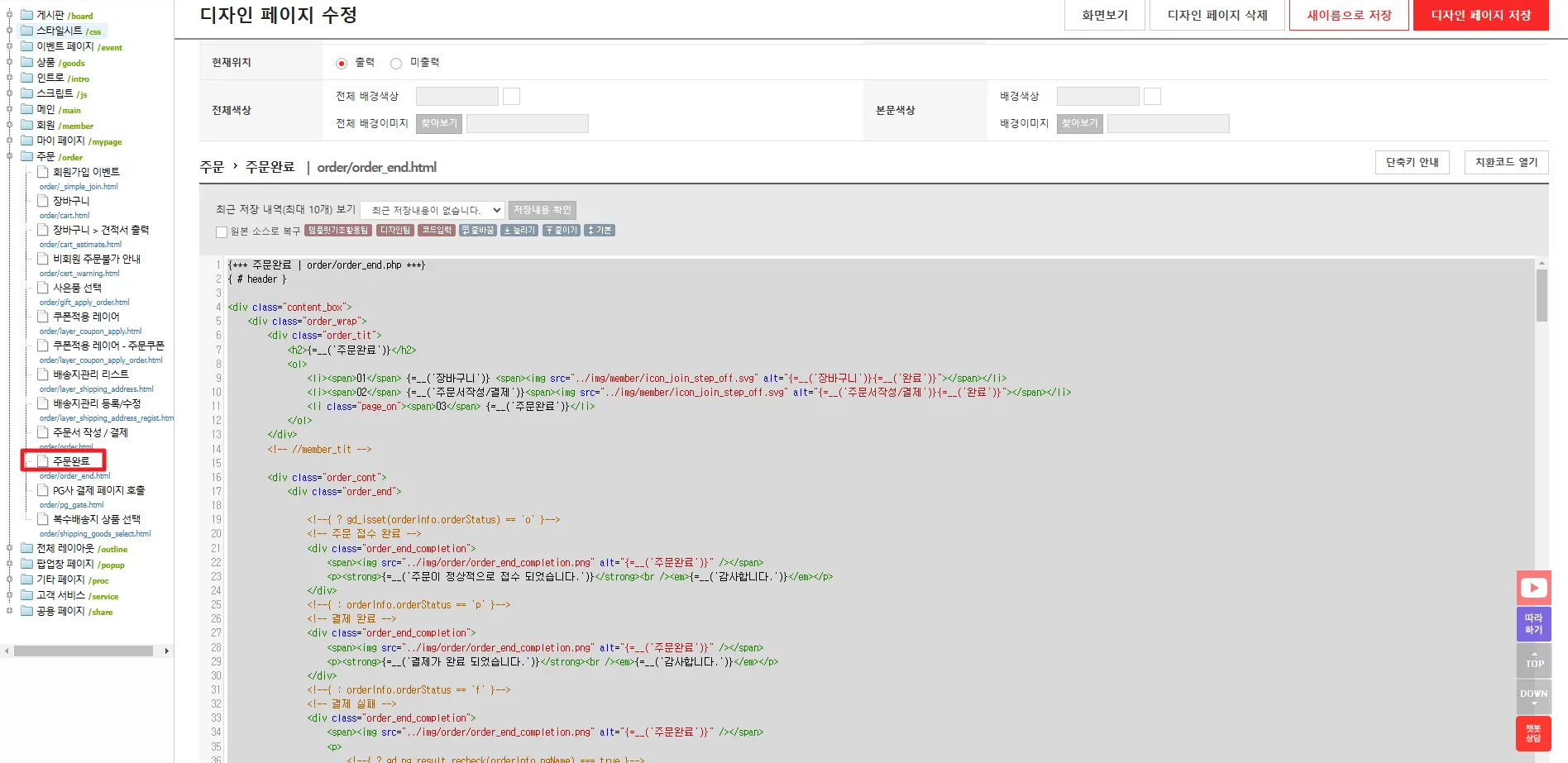경로: 관리자페이지 > 디자인 > 디자인페이지 > 좌측의 [주문] 폴더 > 주문완료 페이지에 purchase 스크립트를 삽입합니다.