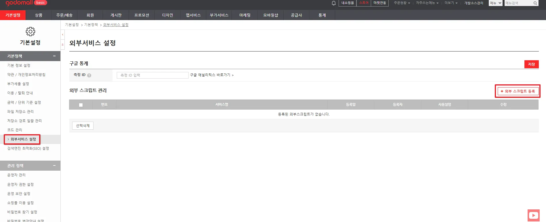 경로: 기본설정 > 기본 정책 > 외부 서비스 설정 > 외부 스크립트 등록 버튼 클릭 > 외부 스크립트 등록