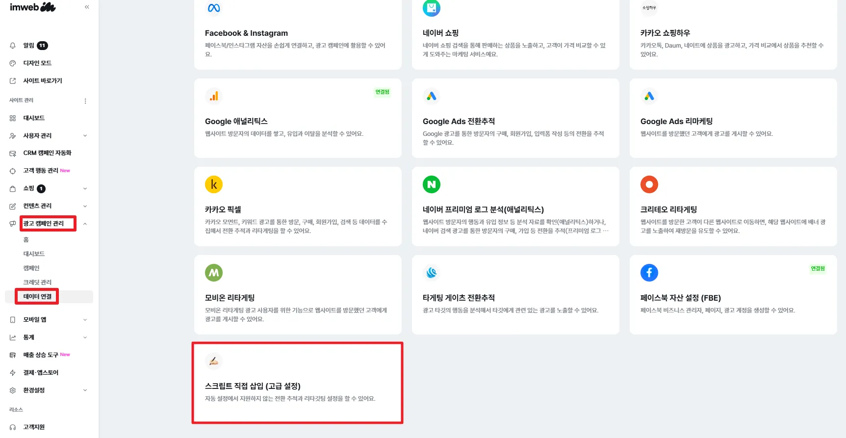 전환(이벤트) 스크립트는 아임웹 어드민의 데이터 연결 페이지에서 스크립트를 직접 설치합니다.