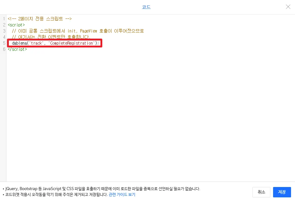 코드 설치하는 창에 스크립트 전문을 붙여넣어도 되며, 혹은 PageView 스크립트를 설치했으면 <script>dablena('track', 'CompleteRegistration');</script> 만 설치해주셔도 됩니다.