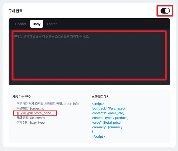 경로: 스크립트 직접 삽입(고급설정) - ‘구매 완료’ 항목의 토글을 우측으로 열어서 활성화시키고, body 영역에 데이블 스크립트 설치합니다.