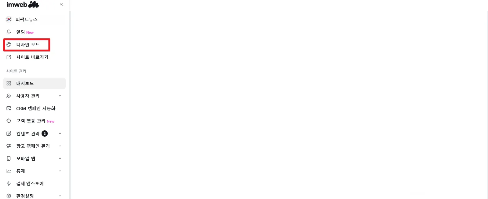 아임웹 어드민에 들어가 좌측 디자인 모드를 클릭합니다.