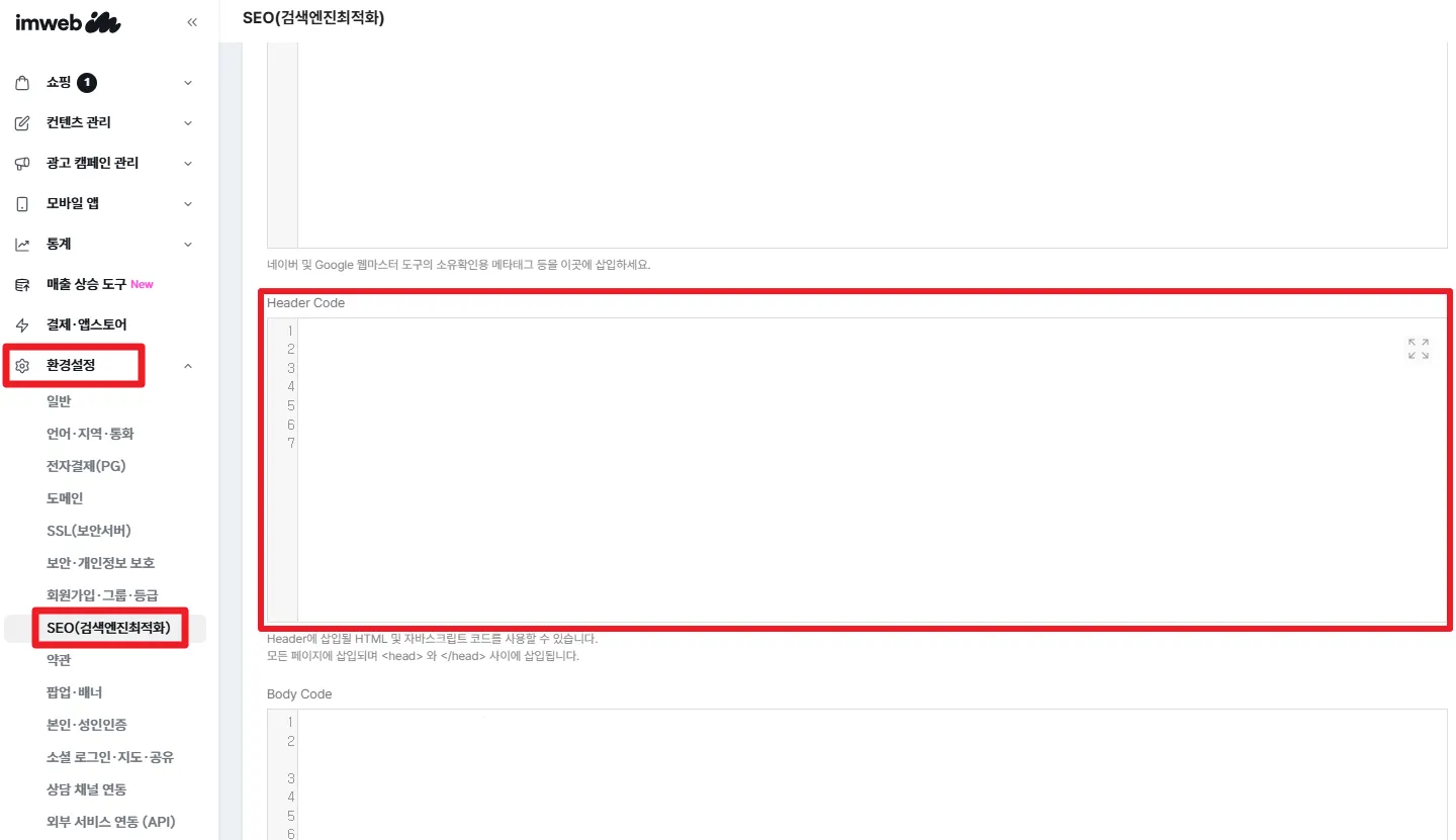 경로 : 내 사이트 선택 - 좌측 바 - 환경설정 - SEO (검색엔진최적화) - Header Code 에 설치