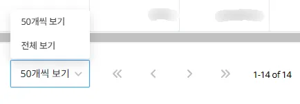 한번에 나타낼 데이터 행의 갯수를 선택할 수 있습니다. 표 하단 드롭다운을 클릭해 한번에 나타낼 행의 갯수를 선택합니다.