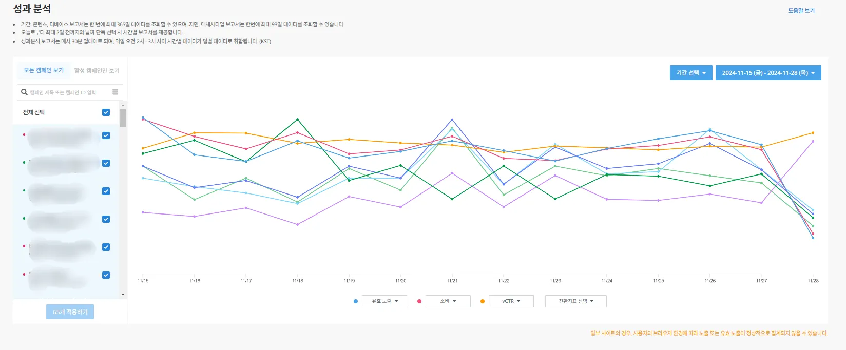 성과 분석 페이지에서는 여러분의 캠페인 데이터를 조회하고 결과를 분석할 수 있습니다. 보고서는 매일 오전 2시 – 3시 업데이트 됩니다. (KST)