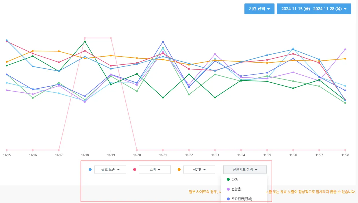 드롭다운 목록상자에서 그래프로 나타내고자 하는 데이터 유형을 선택합니다. 전환 지표를 제외한 기본 지표는 최대 3개까지 함께 조회 가능합니다. 전환 행동 추적 설정을 한 경우 전환 지표가 나타나며 설정한 모든 행동을 한번에 그래프로 확인할 수 있습니다.
