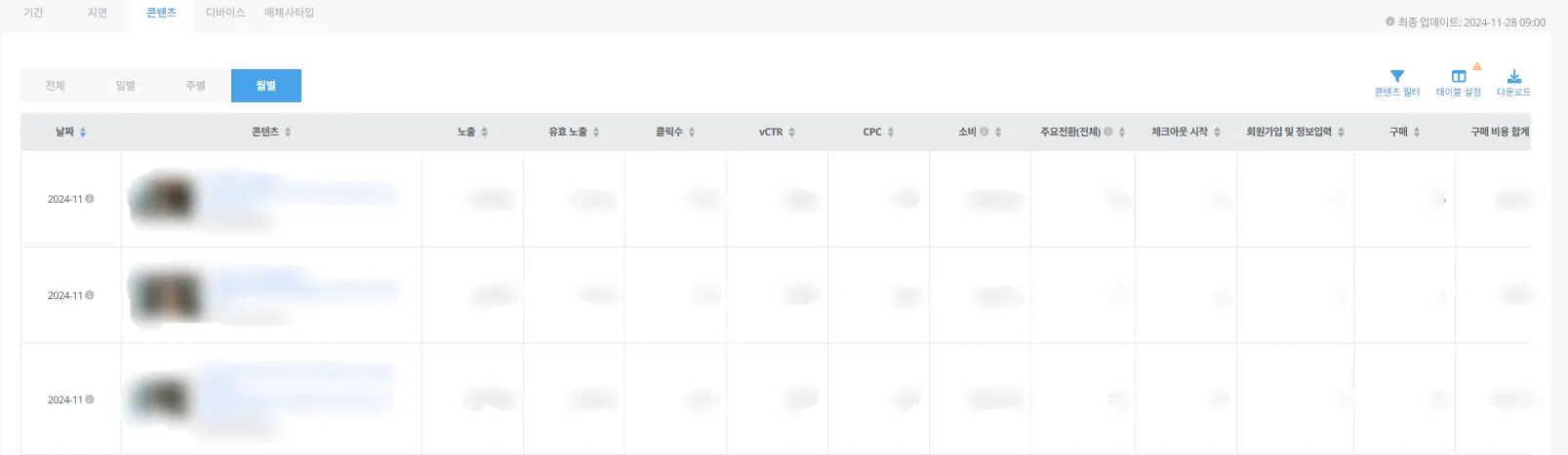 콘텐츠: 노출된 콘텐츠 별 데이터를 조회합니다.