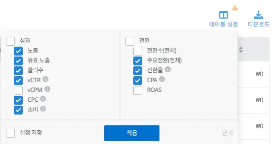 ‘테이블 설정’ 기능으로 원하는 데이터만 쉽게 조회할 수 있습니다. 오른쪽 상단 ‘테이블 설정’ 을 클릭 후 나타내고자 하는 데이터를 선택합니다.
