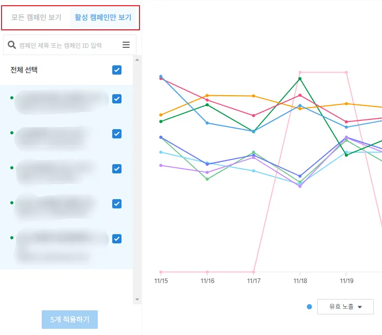 캠페인 상태 : ‘모든 캠페인 보기’ 를 선택하면 캠페인 상태에 상관없이 모든 캠페인의 데이터가 조회 됩니다. ‘활성 캠페인만 보기’에서는 조회 시점 기준 활성화된 캠페인 데이터가 조회 됩니다.