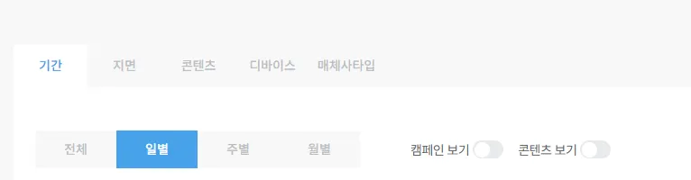기간 별 데이터는 캠페인 및 콘텐츠 별 데이터도 함께 조회할 수 있습니다.`캠페인 보기` 또는 `콘텐츠 보기` 토글을 클릭합니다. 캠페인과 콘텐츠 토글을 함께 클릭하면 캠페인에 속한 콘텐츠 별로 심층 조회됩니다.