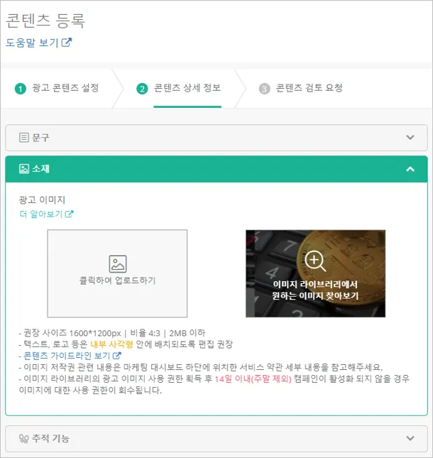 콘텐츠 등록 – ② 콘텐츠 상세정보 – 소재 – 오른쪽 ‘이미지 라이브러리에서 원하는 이미지 찾아보기’ 클릭