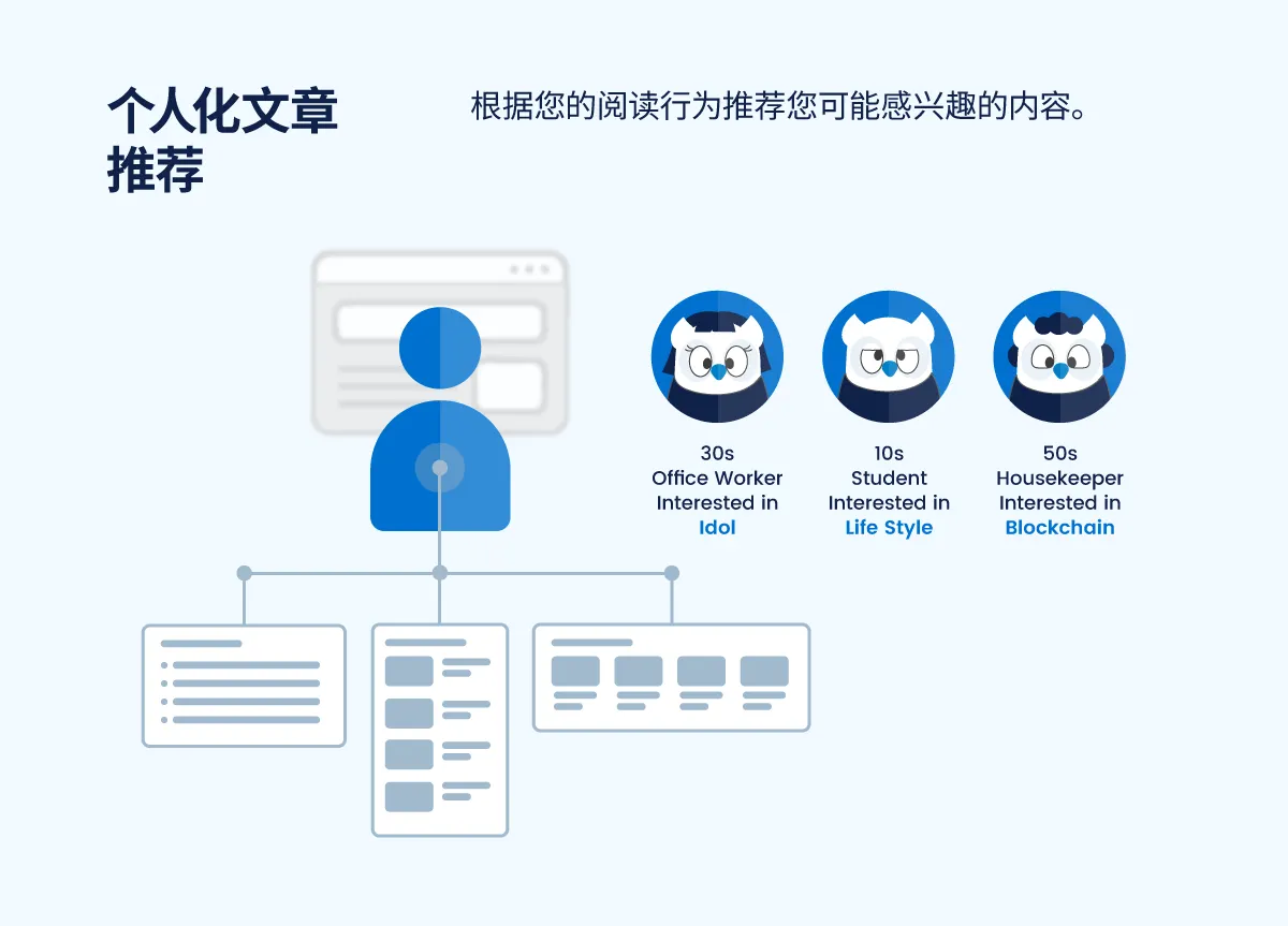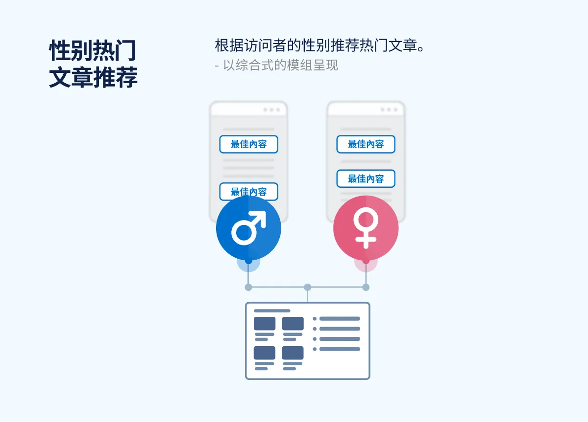 按性别推荐最受欢迎的内容。若用户因阅读的某些内容被推测为女性,则推荐广泛被女性阅读的内容,反之则推荐男性篇好文章。使用标签式的模组,被标示为女性偏好的文章就会推荐给女性用户浏览,而其他的标签提供受男性欢迎的内容给男性用户。