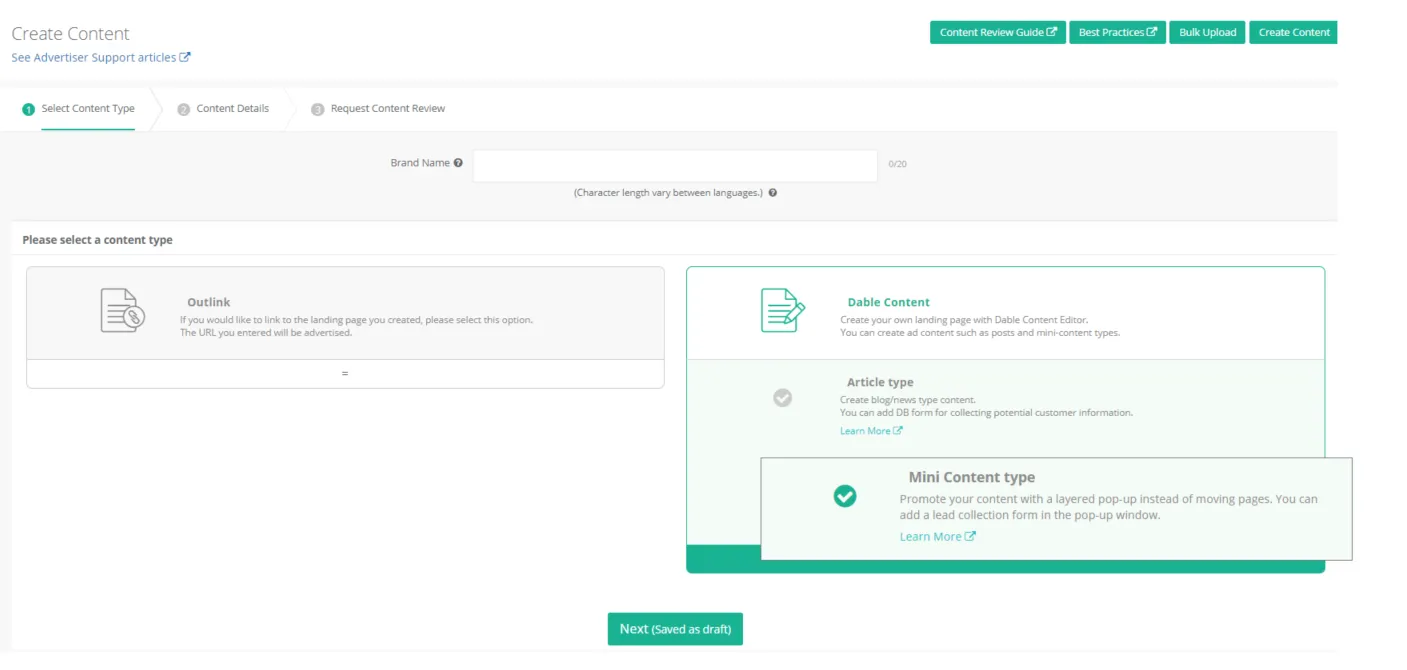 Để bắt đầu tạo nội dung, hãy chọn 'loại nội dung nhỏ' trong Dable Content.