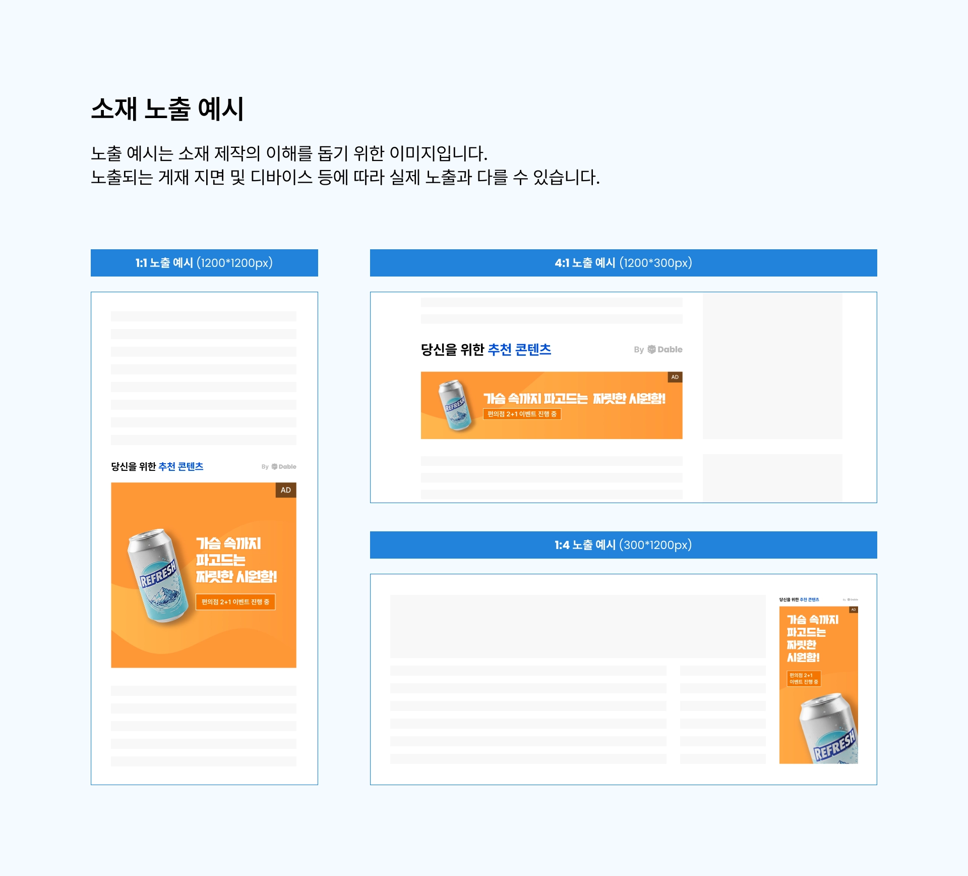 데이블 네트워크의 모든 광고 영역에 최적화된 광고가 노출되기 위해 권장 사이즈로 이미지를 등록해주시길 바랍니다.