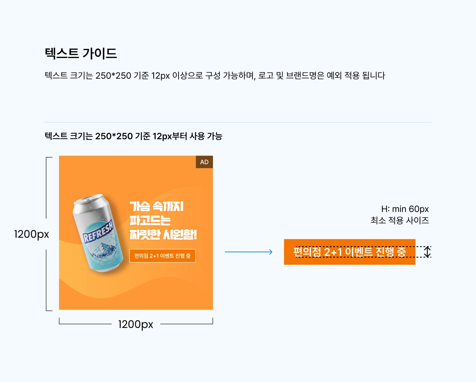 텍스트 크기는 250*250 기준, 12px 이상이어야 합니다.