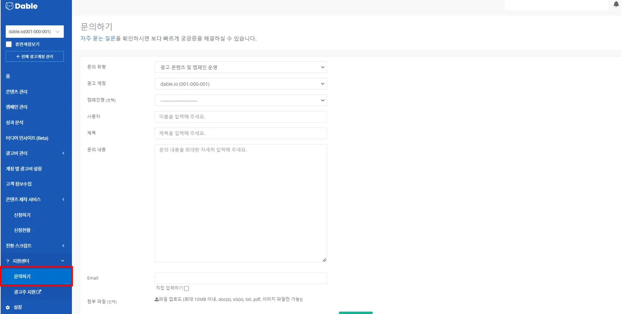 광고 운영 및 성과에 대해 궁금하신 것이 있다면 언제든지 데이블의 지원을 받을 수 있습니다. 마케팅 대시보드를 통해 문의하시면 광고 계정 정보가 함께 전달되어 보다 빠르고 정확한 답변을 받으실 수 있습니다.