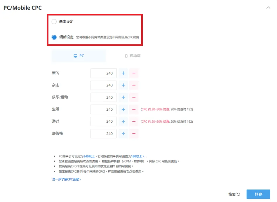 更改CPC设定 > 细节设定