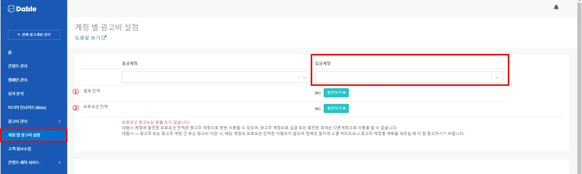 ① 결제 잔액: 대행사가 입금한 금액 중 남은 금액; ② 프로모션 잔액: 데이블이 부여한 보너스 중 남은 금액