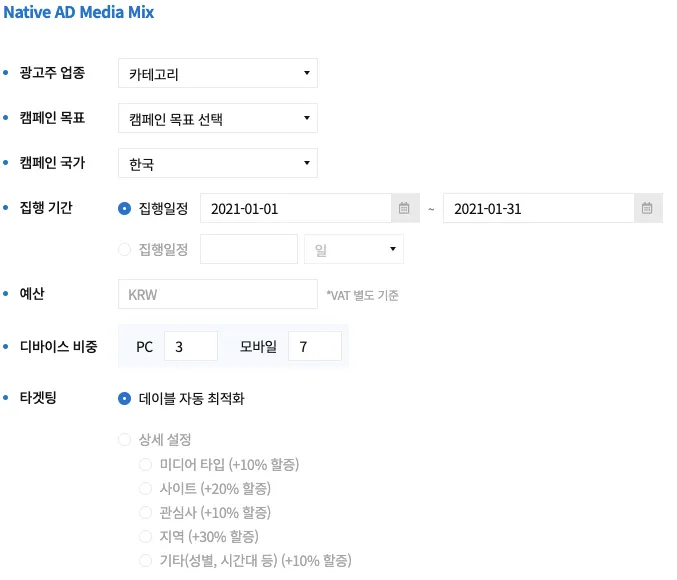 디바이스별 예산 비중을 입력합니다. 디바이스별 예산을 나누지 않는 통합 캠페인은 PC와 모바일 예산이 3:7 비율로 견적서가 만들어집니다. 일반적으로 통합 캠페인의 모바일 비중은 6~70% 입니다. 실제 집행 시 디바이스 별 소진 비율은 달라질 수 있습니다.