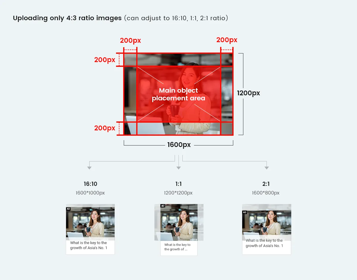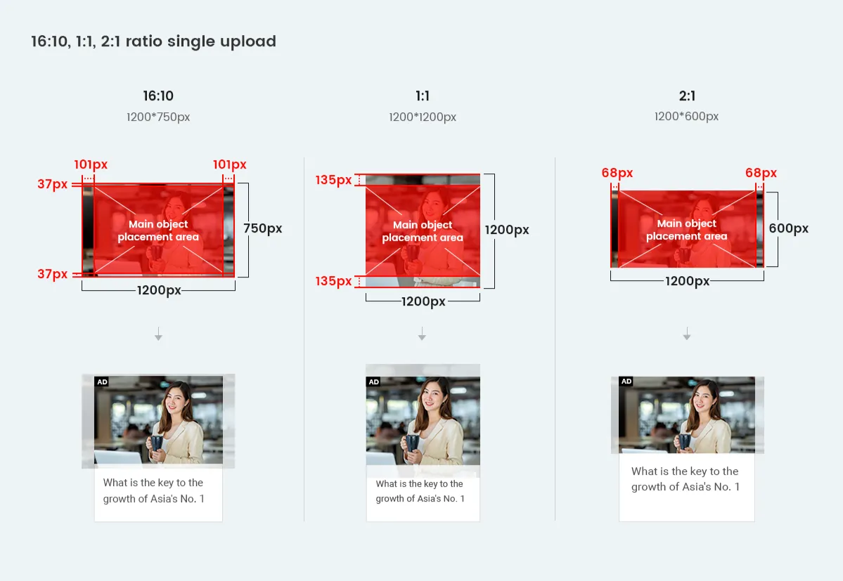 If any text or main object in your image has been cropped after ratio adjustment, you mayย single upload an imageย that has been created with safe zone in mind.