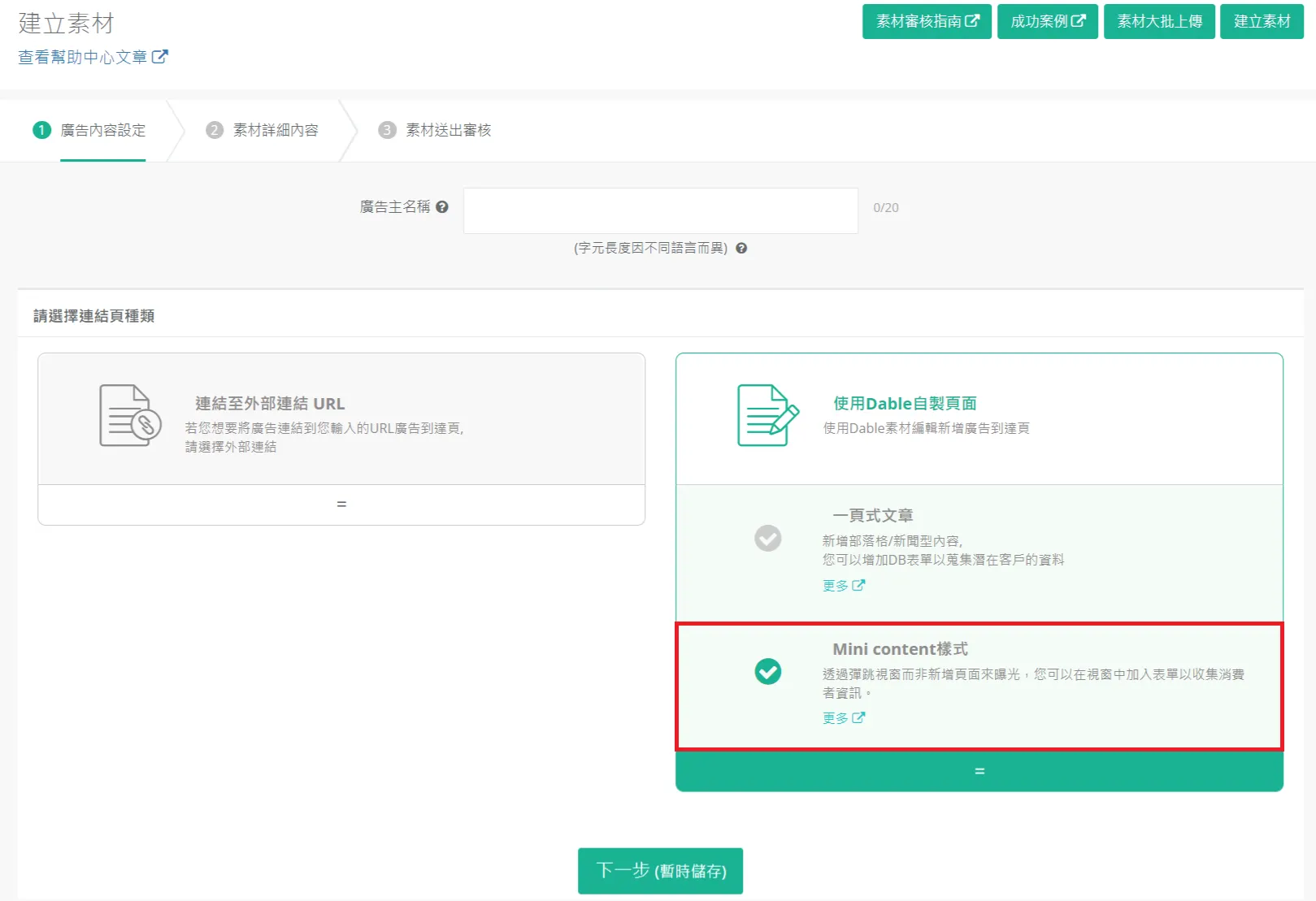 要開始建立素材,請在 Dable 素材下選擇“Mini Content類型”。