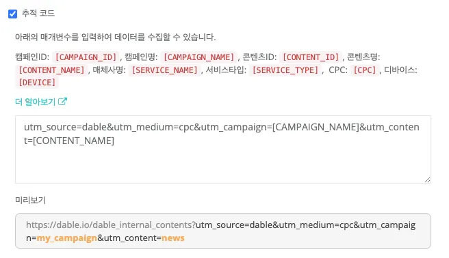 콘텐츠를 생성할 때 URL 추적 코드를 입력하면, 랜딩페이지 URL에 추적코드가 삽입되어 콘텐츠를 클릭한 사용자의 행동을 모니터링할 수 있습니다.