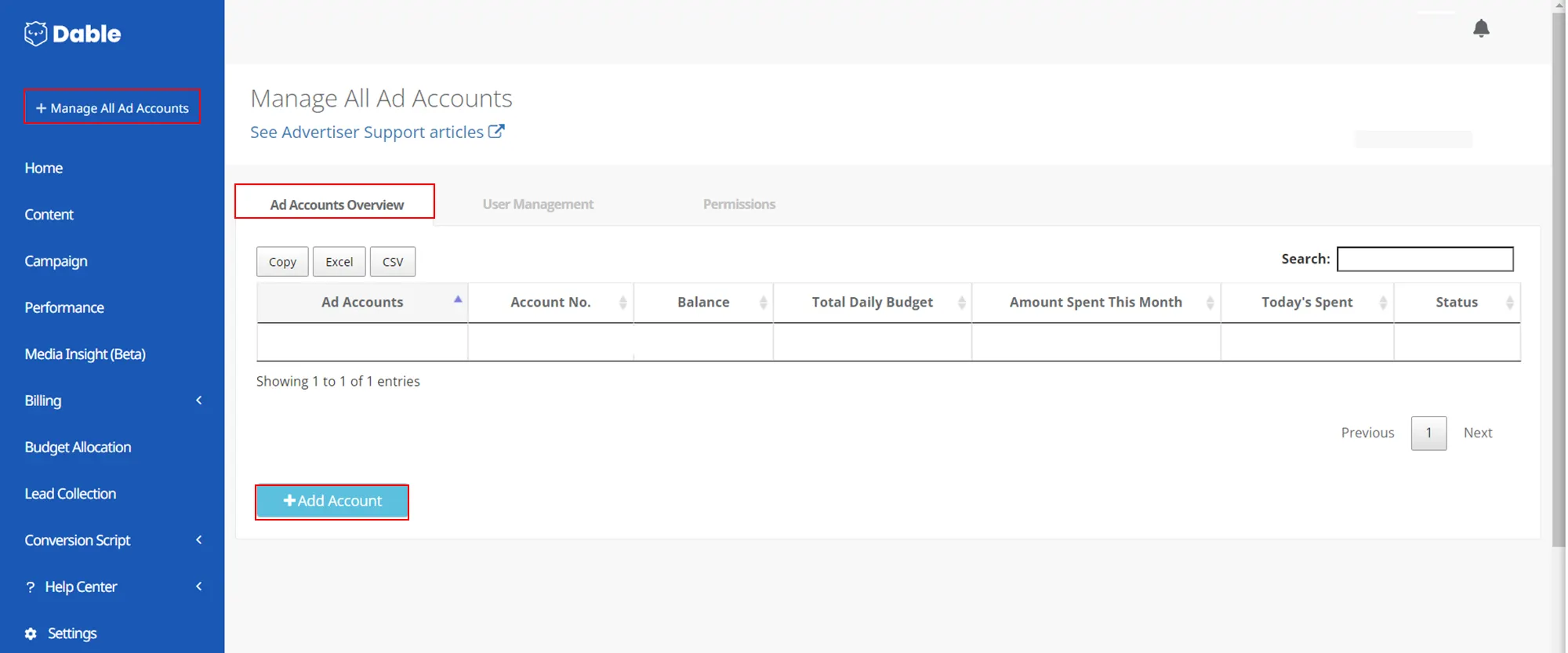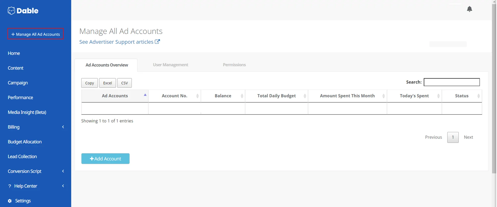 To provide service to an advertiser who is new to Dable, just add the advertiser to your agency account. The advertiser account will go through the review process.
