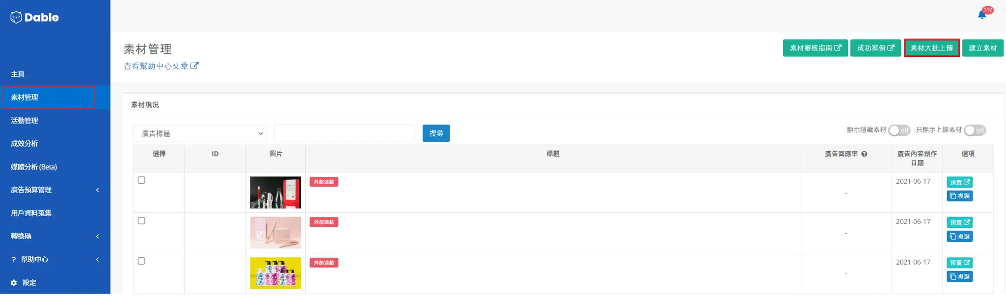 按“儲存”以完成大批上傳程序,Dable 將審核素材是否遵守規範。