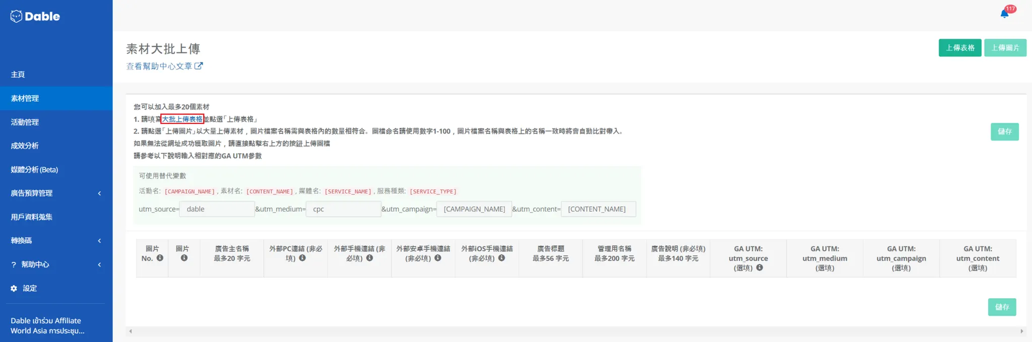 按下素材頁面上的"素材大批上傳"後,點選"大批上傳表格"下載素材建立檔案。