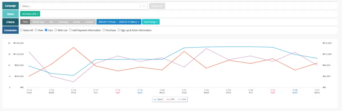 Trong trang Hiệu suất, bạn có thể xem dữ liệu chi tiết về hiệu suất của các quảng cáo đã thực hiện dựa trên thời gian, phương tiện, trang web, chiến dịch, thiết bị, nội dung, v.v. Bạn có thể tối ưu hóa nội dung và chiến dịch của mình và tăng hiệu quả quảng cáo bằng cách sử dụng các dữ liệu này.