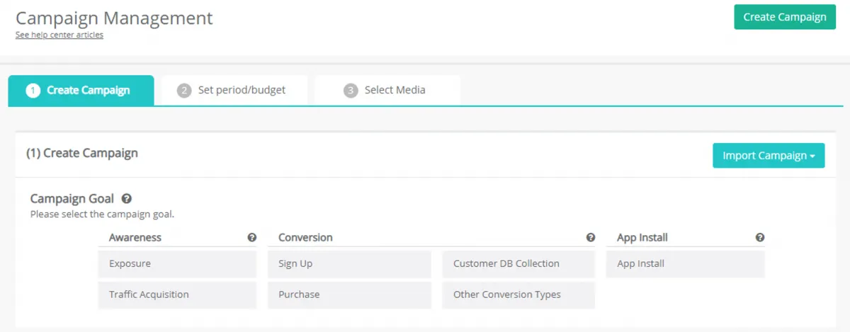 Trong trang Tạo chiến dịch, bạn có thể cài đặt tất cả các khía cạnh liên quan đến quản lý chiến dịch bao gồm mục tiêu chiến dịch, loại chiến dịch (đơn hoặc đa nội dung), ngân sách, tùy chọn hiển thị, tiếp thị lại, khu vực, v.v.