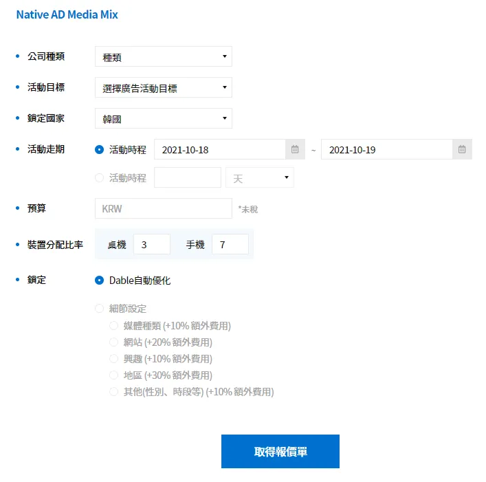 Dable 自动优化:Dable 演算法学习广告活动并自动优化绩效。细节设置:如果您不想使用 Dable 的自动优化系统,您可以自行选择所需的目标选项。收费将根据您的目标选项按比例增加。