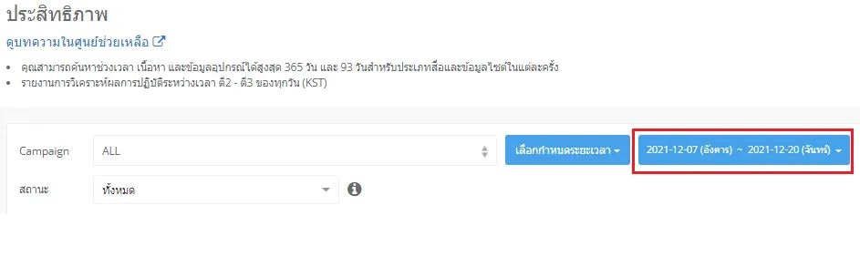 ค่าเริ่มต้น จะแสดงแคมเปญ 'ทั้งหมด' ในระยะเวลา '2 สัปดาห์ล่าสุด’