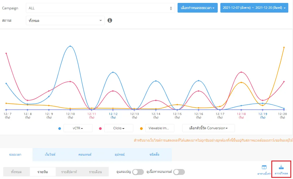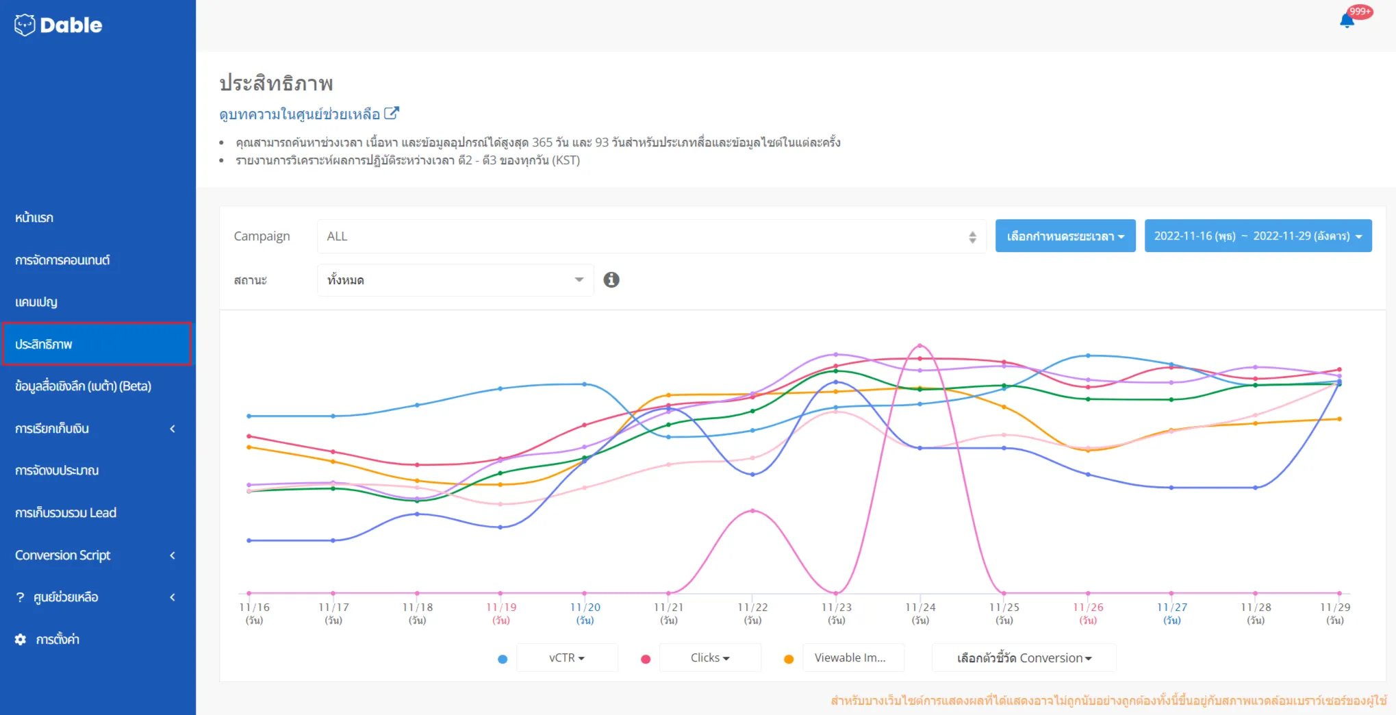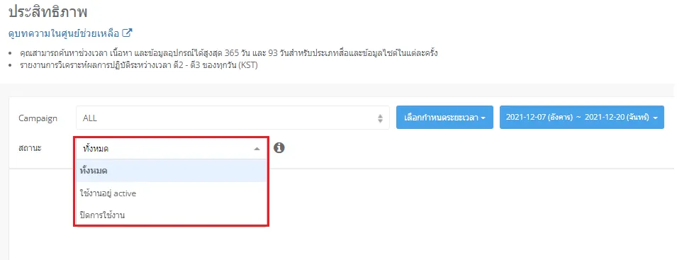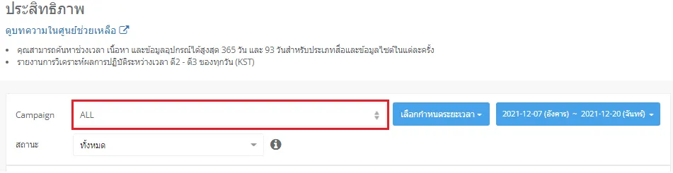คุณสามารถค้นหาและวิเคราะห์ข้อมูลแคมเปญของคุณได้ในหน้าประสิทธิภาพ ข้อมูลประสิทธิภาพถูกอัปเดตทุกวันช่วง ตี 2 - ตี 3 ของทุกวัน