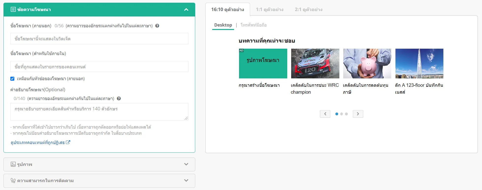 เพิ่มข้อความโฆษณาและรูปภาพ (รูปภาพขนาดย่อ/ Thumbnail) เพื่อใช้ในคอนเทนต์ของคุณ คุณยังสามารถใช้เครื่องมือติดตาม (tracking scripts) เพื่อดูว่าผู้ใช้ทำอะไรหลังจากการคลิกโฆษณาของคุณ