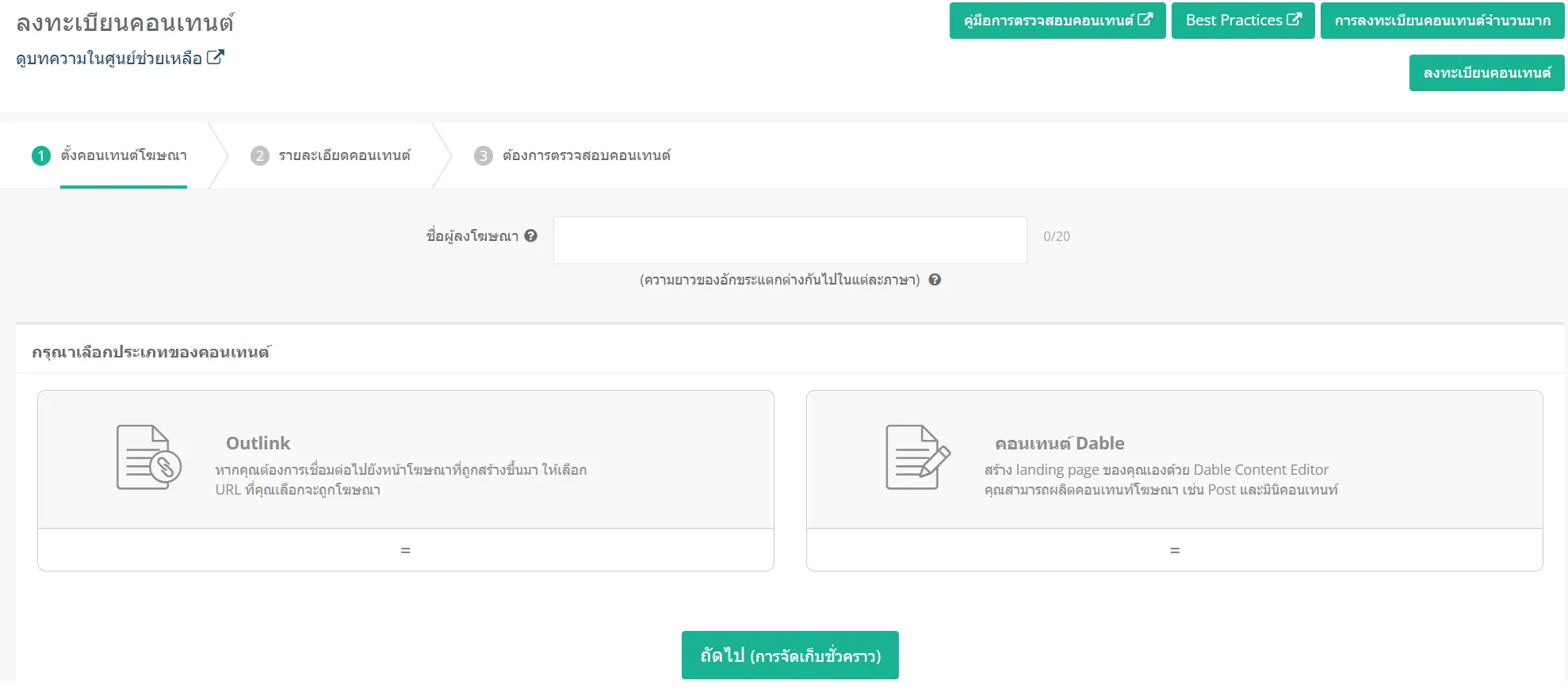 คอนเทนต์ประกอบด้วยสองประเภทตามรูปแบบ Landing Page – Outlink (ใช้ลิงก์ของหน้าเว็บที่มีอยู่) และ คอนเทนต์ Dable (สร้างหน้าเพจกับ Dable) โดยคุณสามารถสร้างคอนเทนต์ได้ใน 3 ขั้นตอนดังต่อไปนี้: