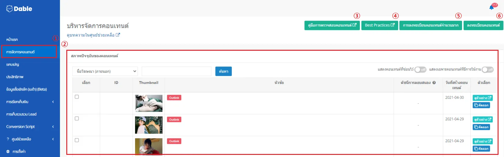 ① ไปที่หน้าการจัดการคอนเทนต์ ② คอนเทนต์ที่สร้างและใช้งานอยู่ทั้งหมดแสดงอยู่ที่นี่ ③ คุณสามารถดูคู่มือการตรวจสอบคอนเทนต์ของเรา ④ คุณสามารถตรวจสอบแนวทางปฏิบัติที่ดีที่สุดเกี่ยวกับโฆษณาของเราได้ ⑤ คุณสามารถเพิ่มคอนเทนต์ได้หลายรายการพร้อมๆกัน ⑥ ไปที่หน้าสร้างคอนเทนต์