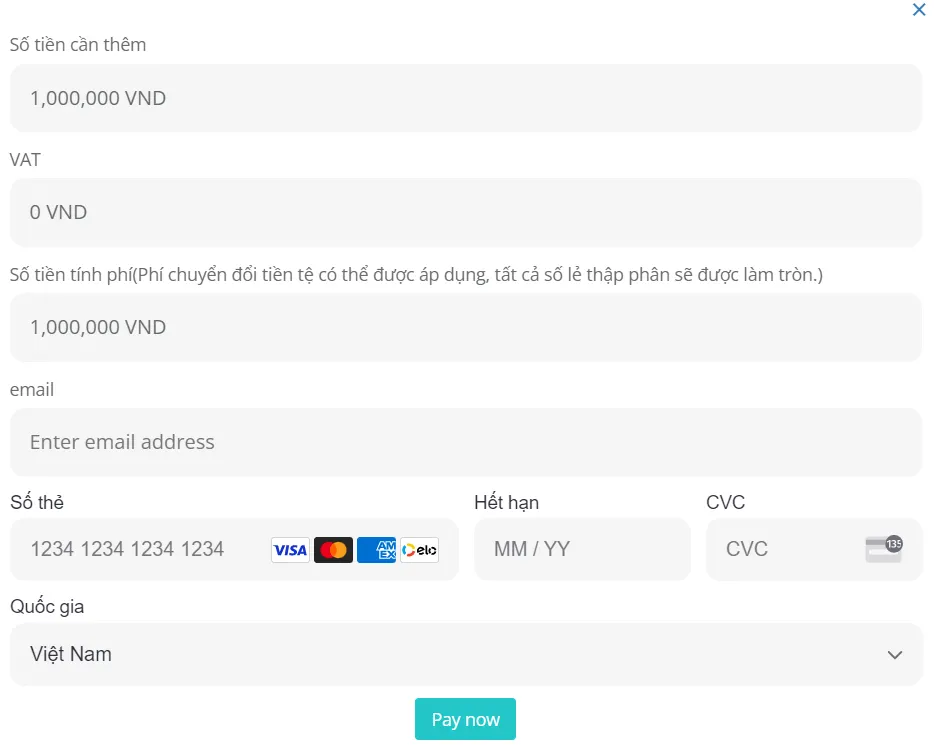 Sau đó, quý khách sẽ được dẫn đến một trang pop-up nơi quý khách có thể nhập chi tiết thẻ của mình (số thẻ, CVC, ngày hết hạn).