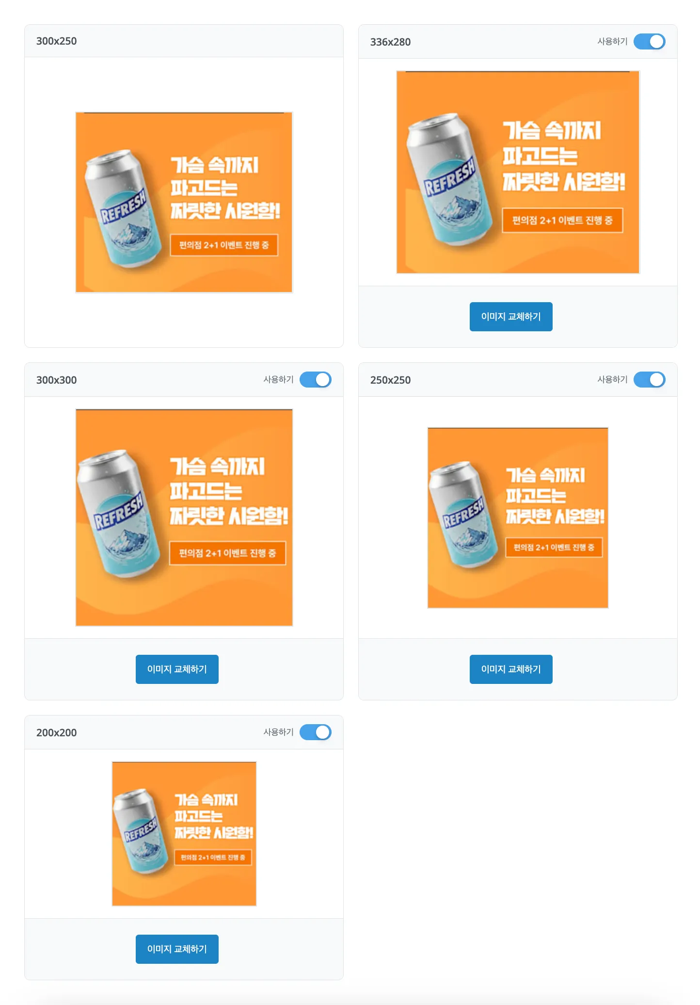 광고가 노출될 사이즈 별로 사용여부를 선택할 수 있습니다.