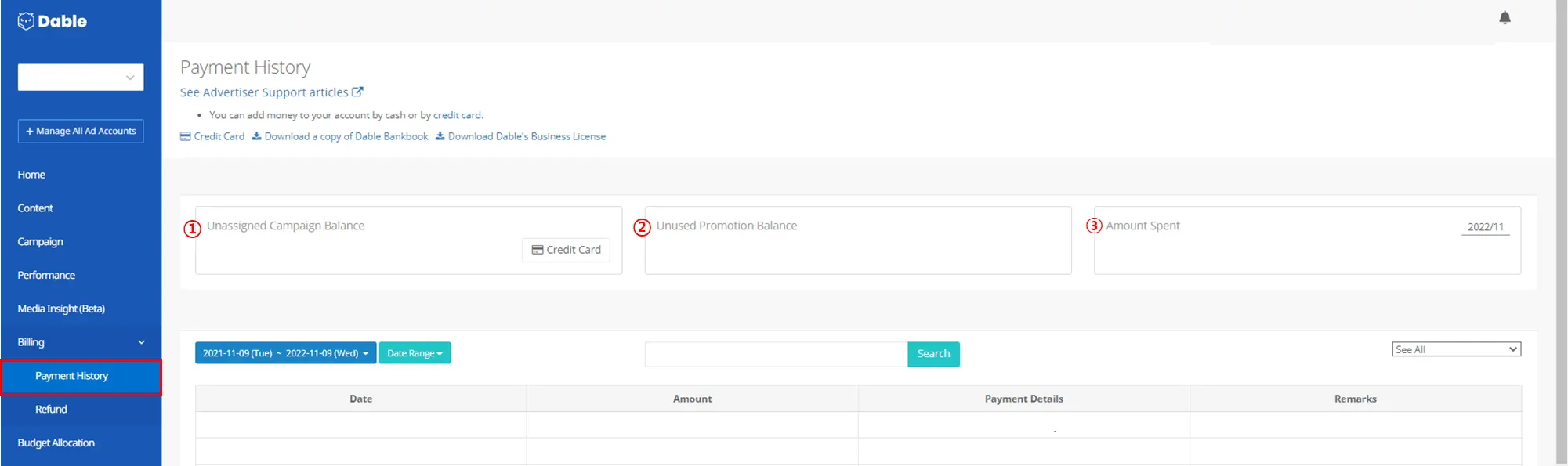 ① Unassigned Campaign Balance: Amount of budget that hasn’t been allocated to a campaign; ② Unused Promotion Balance: Amount of Promotion that hasn’t been allocated; ③ Amount Spent: Budget spent within the account.
