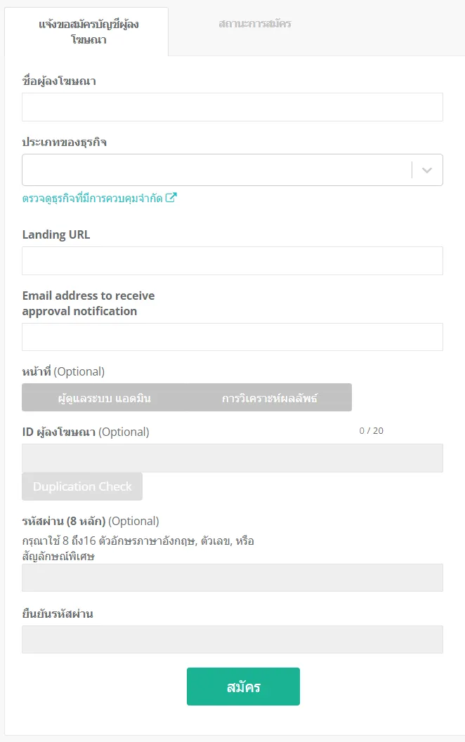 กรอกข้อมูลผู้โฆษณาและอีเมลสำหรับใช้รับการแจ้งผลอนุมัติบัญชี