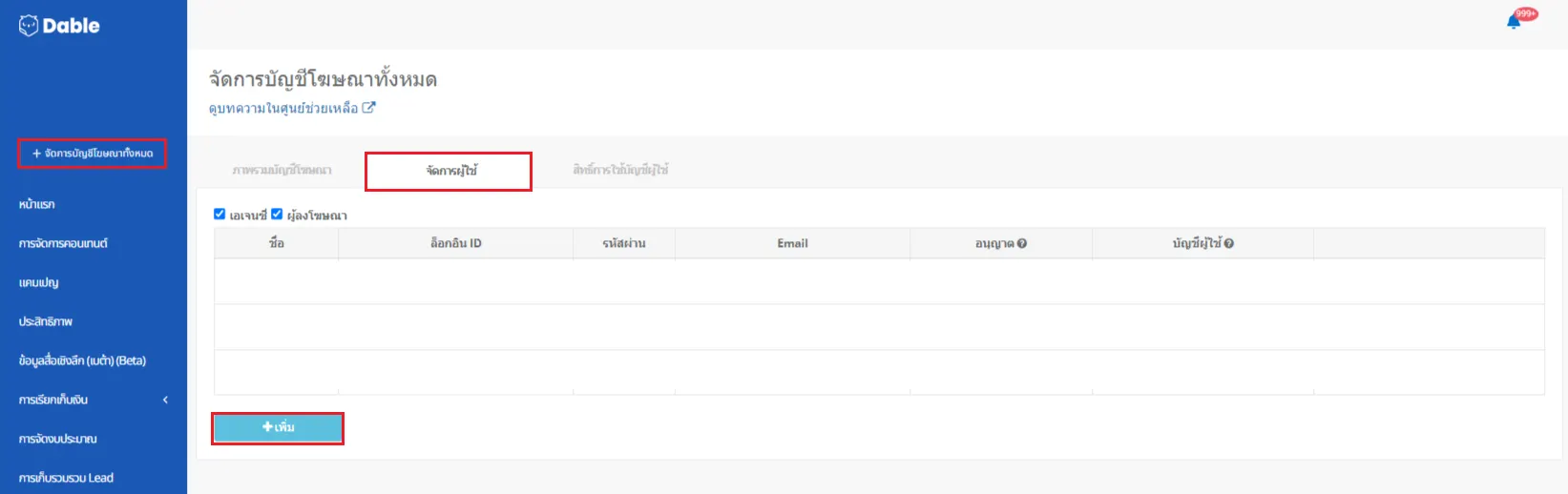 คุณสามารถเชิญผู้โฆษณา หรือเจ้าหน้าที่ที่ดูแลบัญชีผู้โฆษณานี้เพื่อมอบสิทธิการเข้ามาใช้แดชบอร์ดการตลาด ผู้ใช้งานจะถูกแบ่งหมวดหมู่ระดับการอนุญาตและประเภทบัญชีของพวกเขา