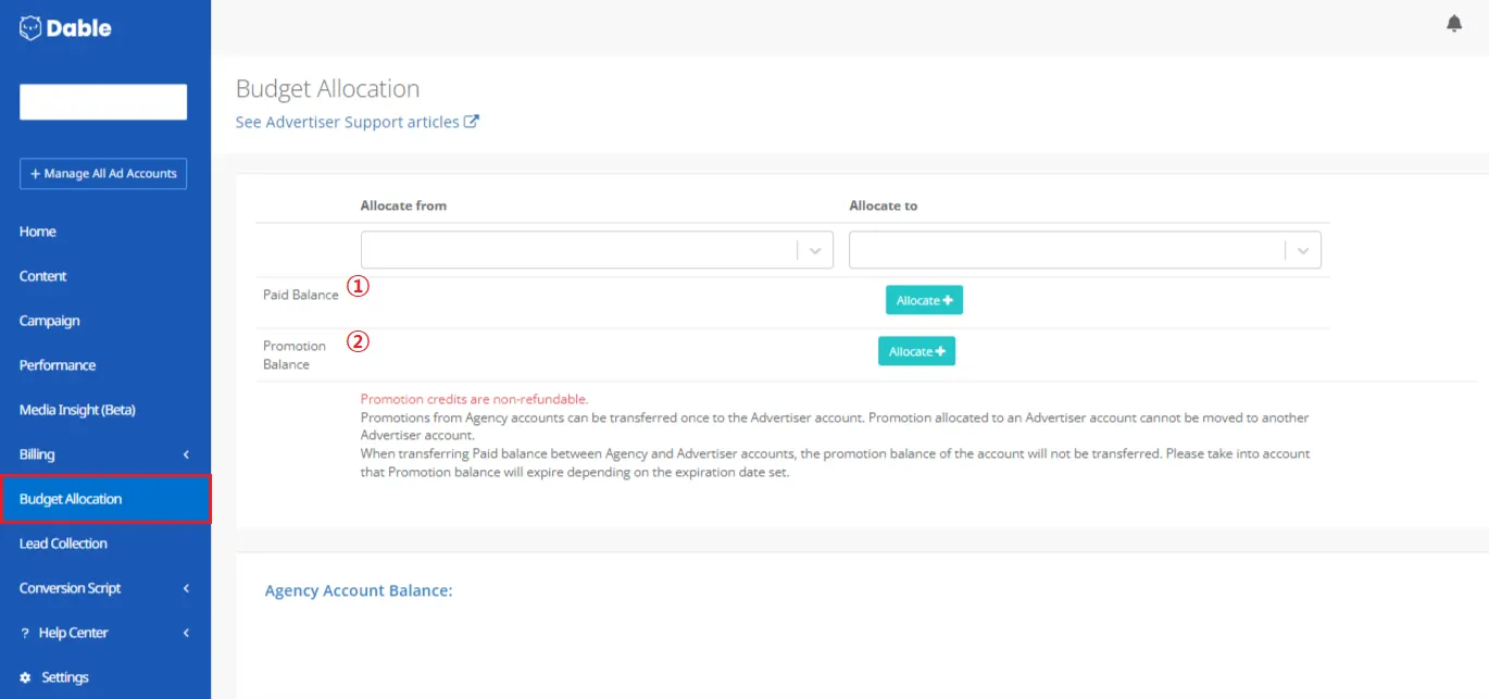 ① Paid Balance: Balance that has been paid for by the Agency ② Promotion Balance: Promotion that has been provided by Dable.