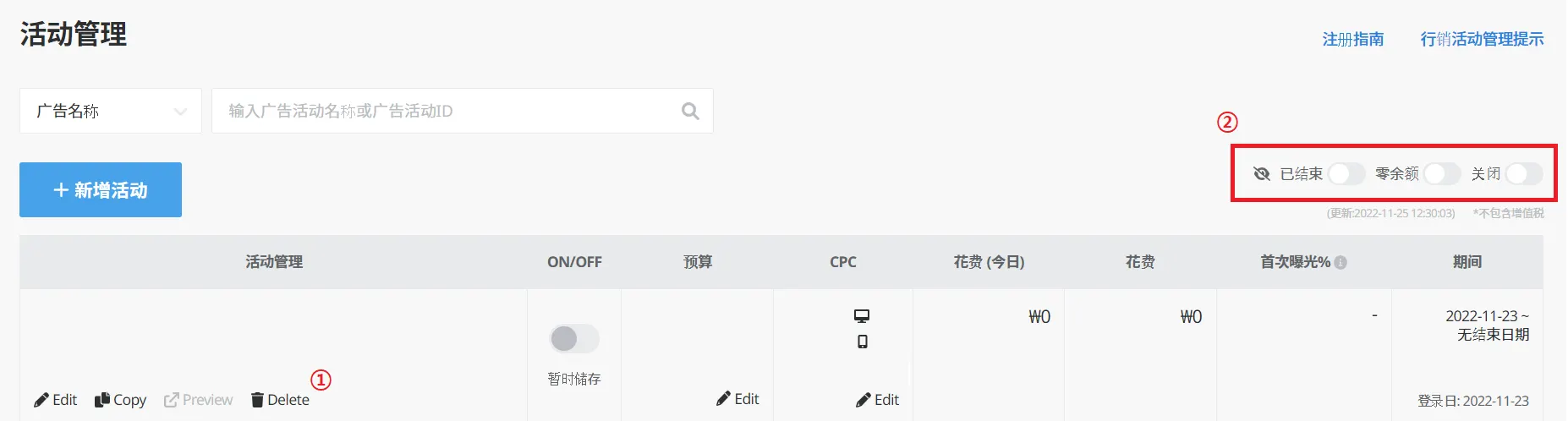 无法删除已启用或之前启用过的广告活动(已产生花费),您可以在广告活动清单中将其设定为隐藏。