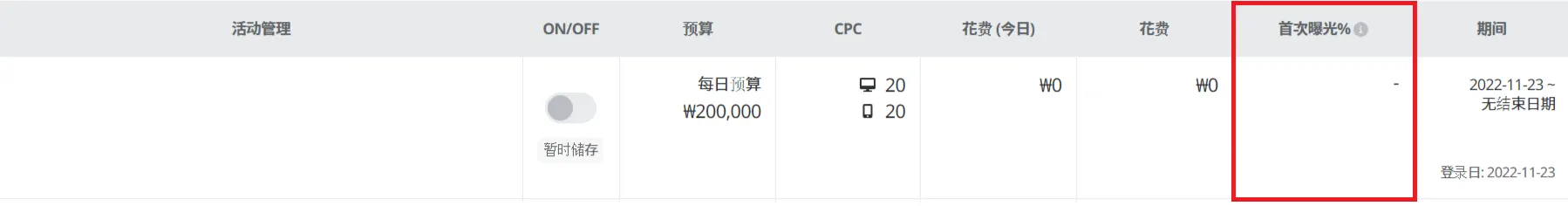 首次曝光%:首次看到广告活动的用户百分比,计算方法是将第一次观看的人数除以指定日期的总曝光次数。