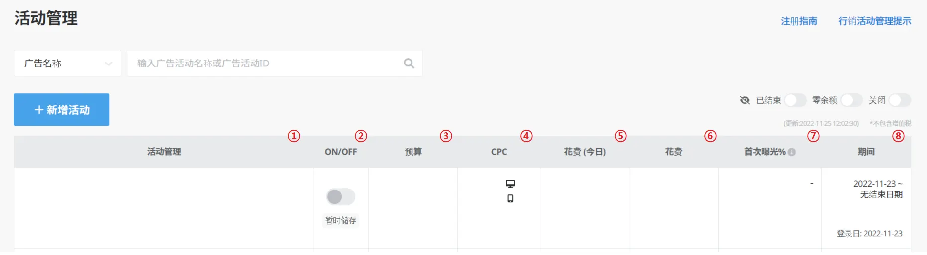 您可以在“活动管理”页面上查看已建立或储存为草稿的广告活动。
