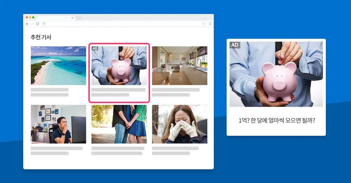 데이블의 미디어 네트워크에 게재되는 광고는 데이블 고유의 영역에 게재됩니다. 이 영역은 개인화 추천 영역으로, 사용자의 주의를 집중시키는 주목도 높은 공간입니다. 데이블이 콘텐츠를 추천하는 방식에 대해 자세히 더 자세히 알아보세요.